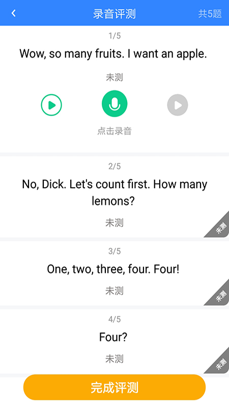3. 语音评测:单词、句子、段落、测试等板块,全面增设语音评测功能,学生可检测自身发音,并根据提示反复练习、跟读直至测评合格。