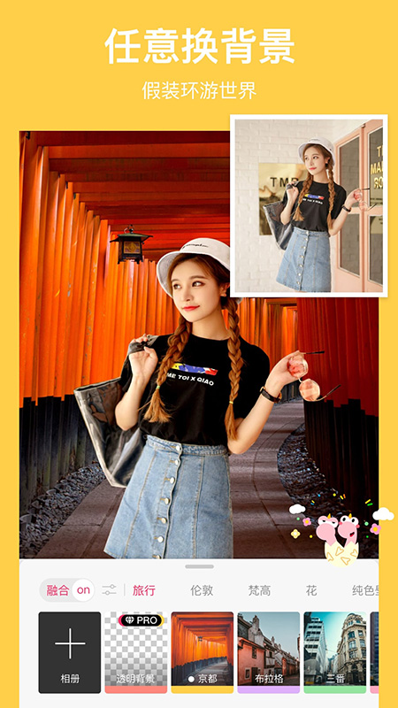 内置丰富背景素材可供替换,更换背景后,点击「融合」按钮,人物瞬间融入背景