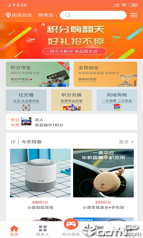 今天积分APP,倾情呈现积分夺宝、全民、本地、积分兑换以及同城购物等多样化特色服务,为实体商家带来更具价值的消费促销体验。