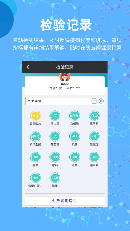 检测中心---用户可随时利用智能手机扫描,进行尿液14项、阴道炎六联检、便潜血、小儿腹泻等多项检测,检验记录自动保存,并可进行趋势分析,随时监测健康状态。