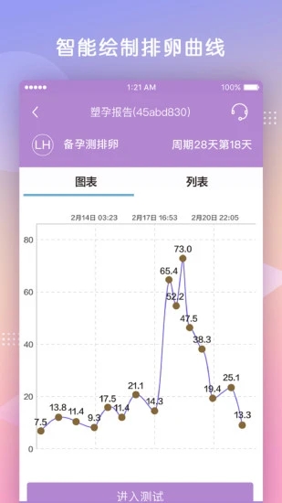 1、手机智能检测LH数值,自动绘制排卵曲线,科学指导同房;