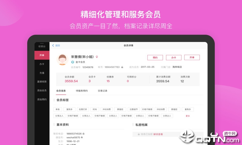 全新视觉体验,高效处理门店日常经营事务,智能管理会员的预约、到店服务及服务结束后的收款全流程。