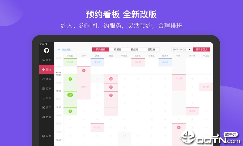 3、顾客可在线预约服务及到店时间,通过预约中心有效管理与新增预约,合理安排排班。