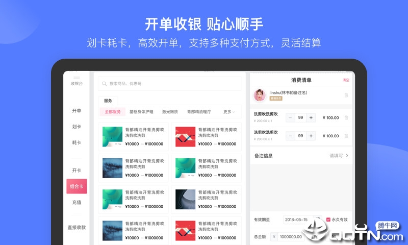 2、与开单系统无缝结合的收银台,支持微信、支付宝、储值卡等多种支付方式。
