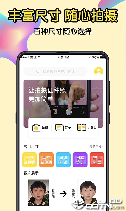 免费,运用人像识别技术,展现自然之美,智能化人像处理;手动修图,背景完美无瑕,精致细腻;丰富尺寸随心拍摄,百种选择任您所愿;电子照片存储于手机,立刻拍摄,快捷省心。