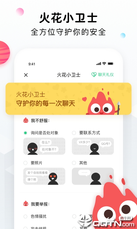 【温暖守护】:火花全「心」出发,温暖与礼仪并存,小卫士守卫你的每一次聊天,让交友不再心累,让相遇「零」负担。