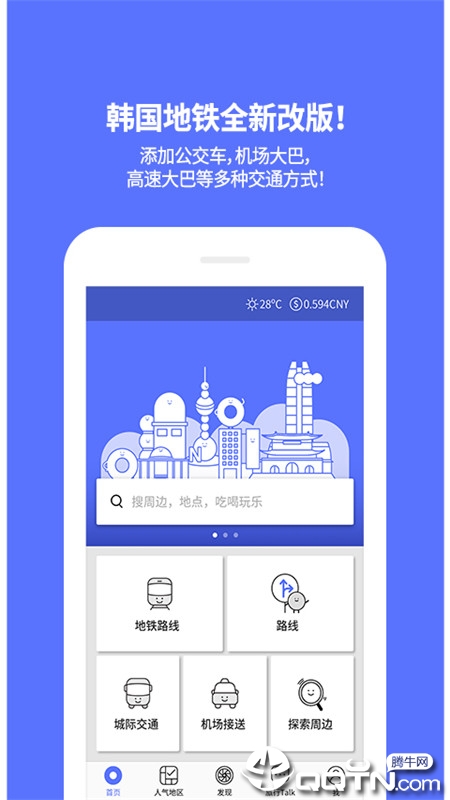 韩国地铁:让我们开启旅程吧!韩国地铁应用为您提供首尔、釜山、大邱、大田、光州等地区的中文(简体/繁体)地铁图,以及地铁路线和周边的旅游、美食、购物及等信息。